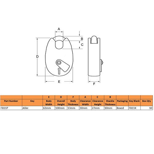 The FB11 is a UK Fire Brigade approved 4 lever padlock with a 63mm galvanised body and 10mm shackle, which suits a variety of applications.