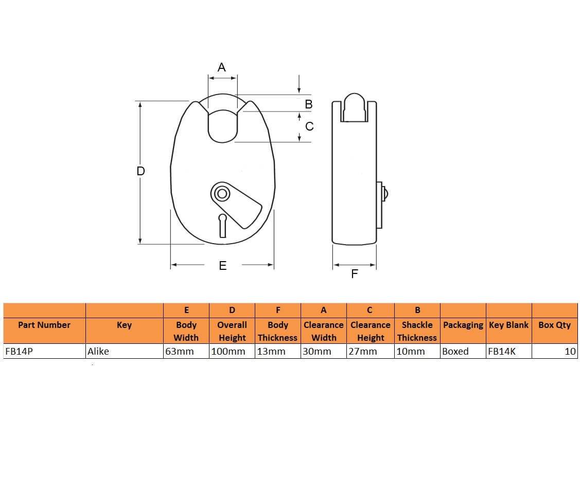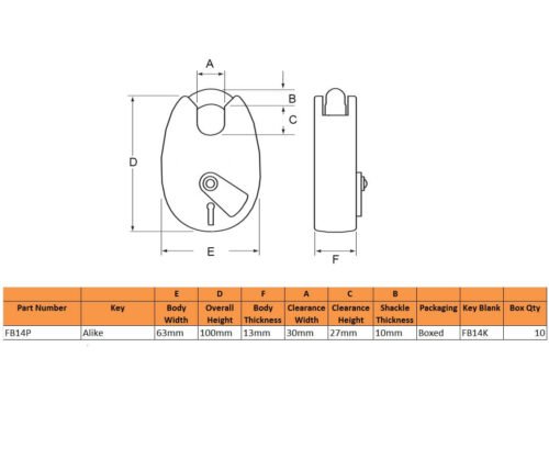 The FB14 is a UK Fire Brigade approved 4 lever padlock with a 63mm yellow body and 10mm shackle, which suits a variety of applications.